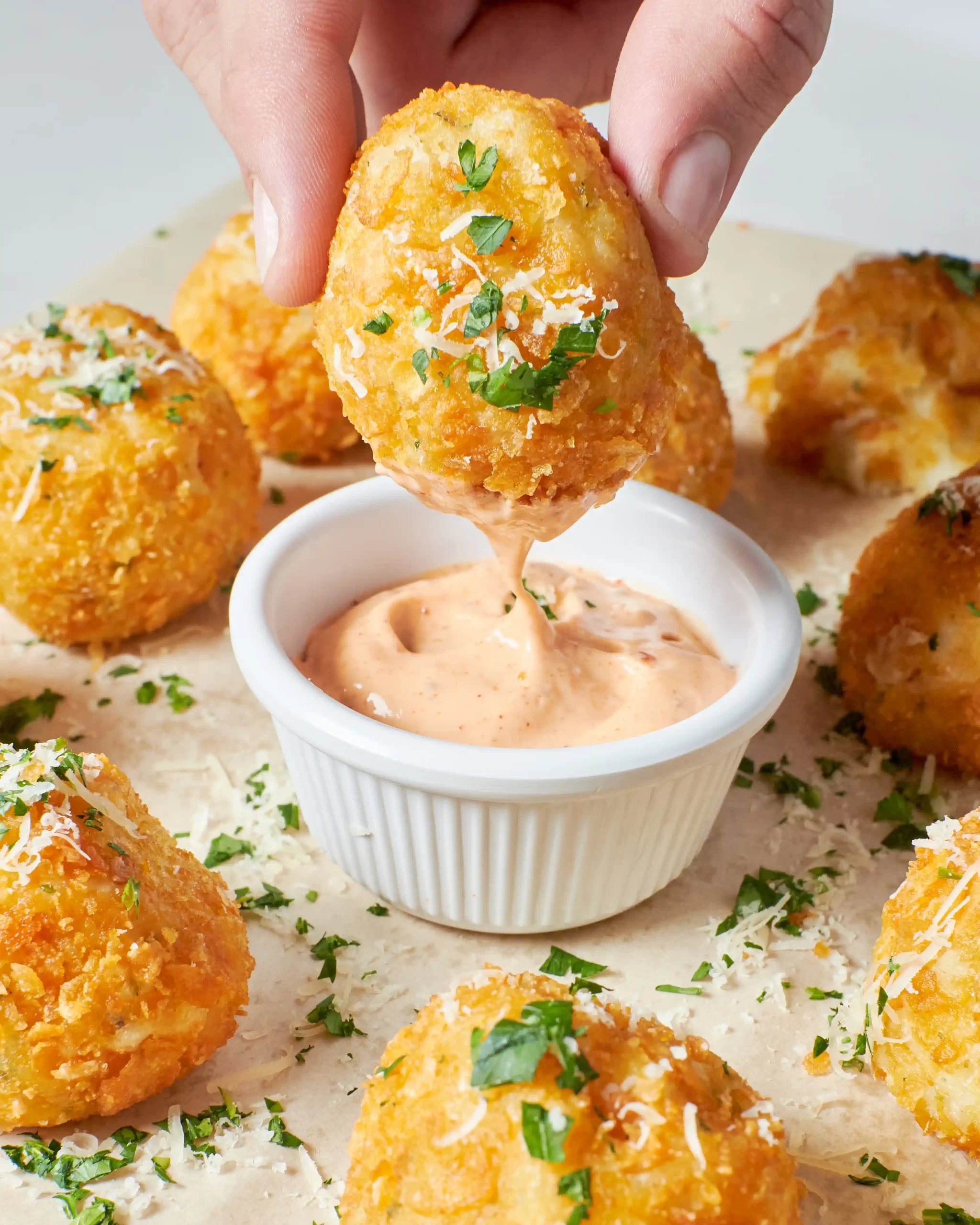 5. Servir las bolitas de papa rellenas con tu aderezo picante favorito.